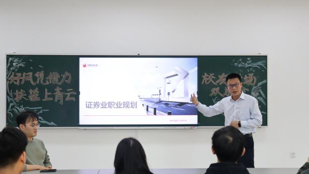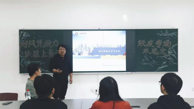 为打造“学校+校友”就业共同体,下午四点,以“好风凭借力,扶摇上青云”为主题的校友专场双选会活动在求是楼133顺利举行。双选会上,国联、华英证券公司业务总经理、优秀校友戴雨皓结合自身经历,从校园和职场两个方面分享工作经验和心得,详细介绍了其公司的基本信息、企业文化以及发展前景,鼓励学弟学妹们要把握好在校时光,提升综合素质,增加自己未来职业生涯“砝码”。与此同时,国联证券重庆营业部总经理孟书勇勉励大家从多角度提升自己,强化优势,并表示将积极为我院学生提供更多实习机会,打造更多在实践中锻炼、提升的平台。