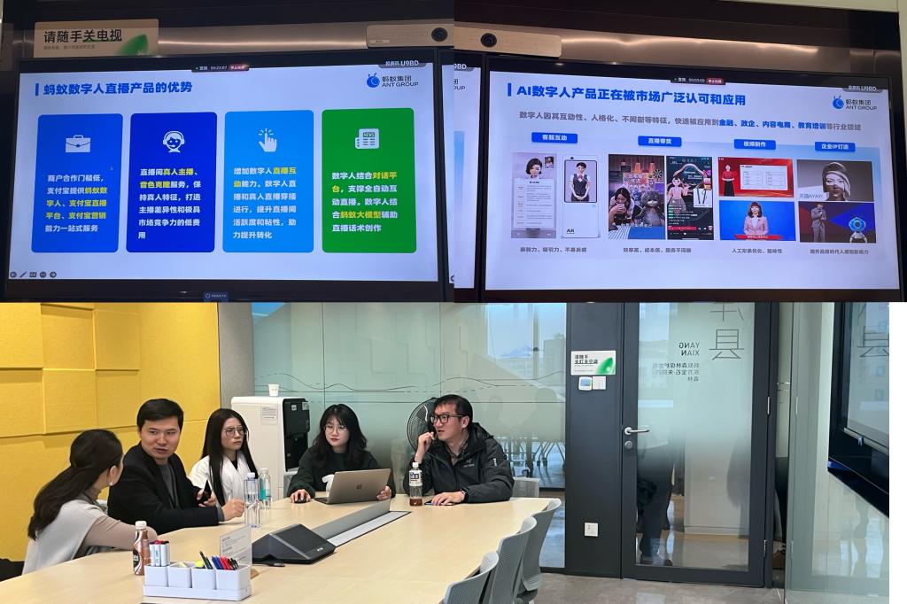 随后,钟敏一行来到蚂蚁集团参观交流,集团支付宝AI数字人产品运营经理介绍了该项目的发展现状。支付宝作为拥有10亿+消费者用户的数字生活服务平台,目前在大力推动支付宝直播、AI数字直播、AI数字应用及校园派项目。如今虚拟人或称为数字人已成为了当下及未来几年的主要趋势之一,AI数字人及其人机交互已经深入到各行各业中,其数字人技术低成本高效率、个性化定制、互动性强、高真实度、无时间和空间限制、数据积累、可定制性高、操作简单以及降低风险低等优势与特点明显,这使得AI数字人在商业化应用、娱乐应用和教育应用等方面具有广泛的应用前景。通过行业的推动,AI数字人在未来将得到更多的变革与重塑。