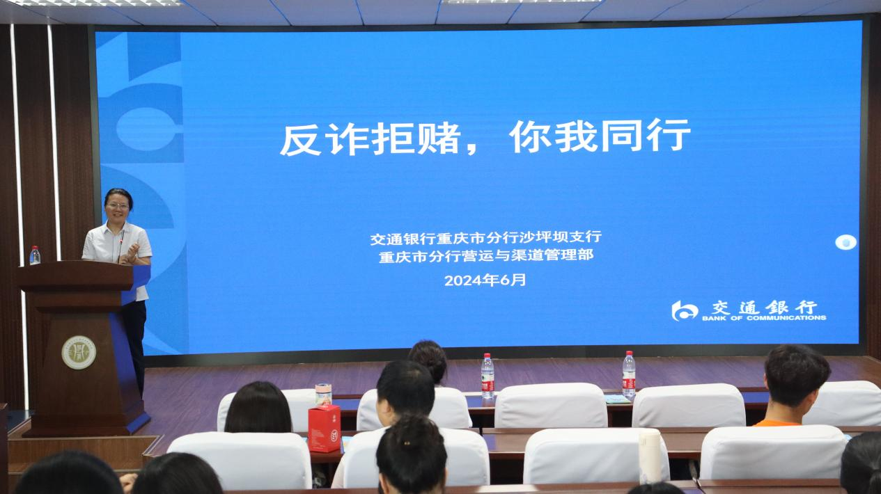 为深入强化大学生的反诈意识,有效避免电信诈骗对大学生造成的不良影响,确保大学生个人财产的安全,mansion88明升于2024年6月20日下午三点半在求是楼517教室举办了一场专题反电信诈骗知识讲座。此次讲座特邀交通银行重庆市分行沙坪坝支行副行长蔡依莉、叶在清,以及渠道与营运部风险管理部负责人邓婧担任主讲嘉宾,2022级100余名学生代表参与。