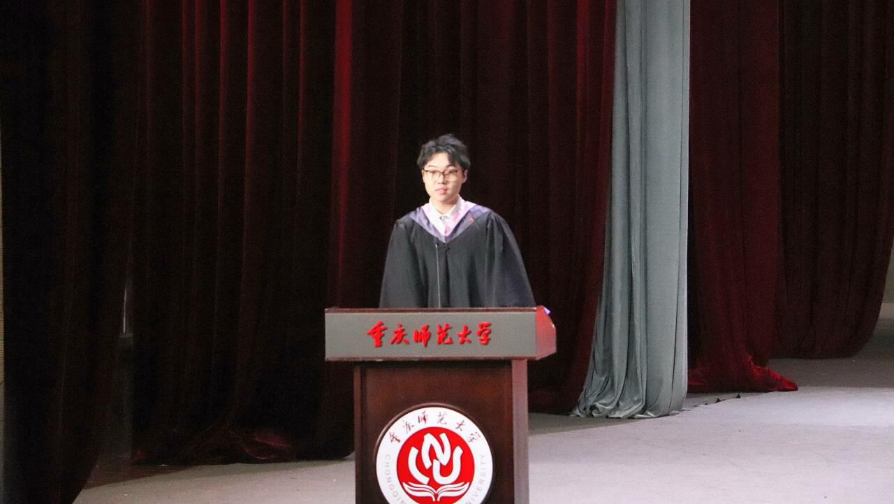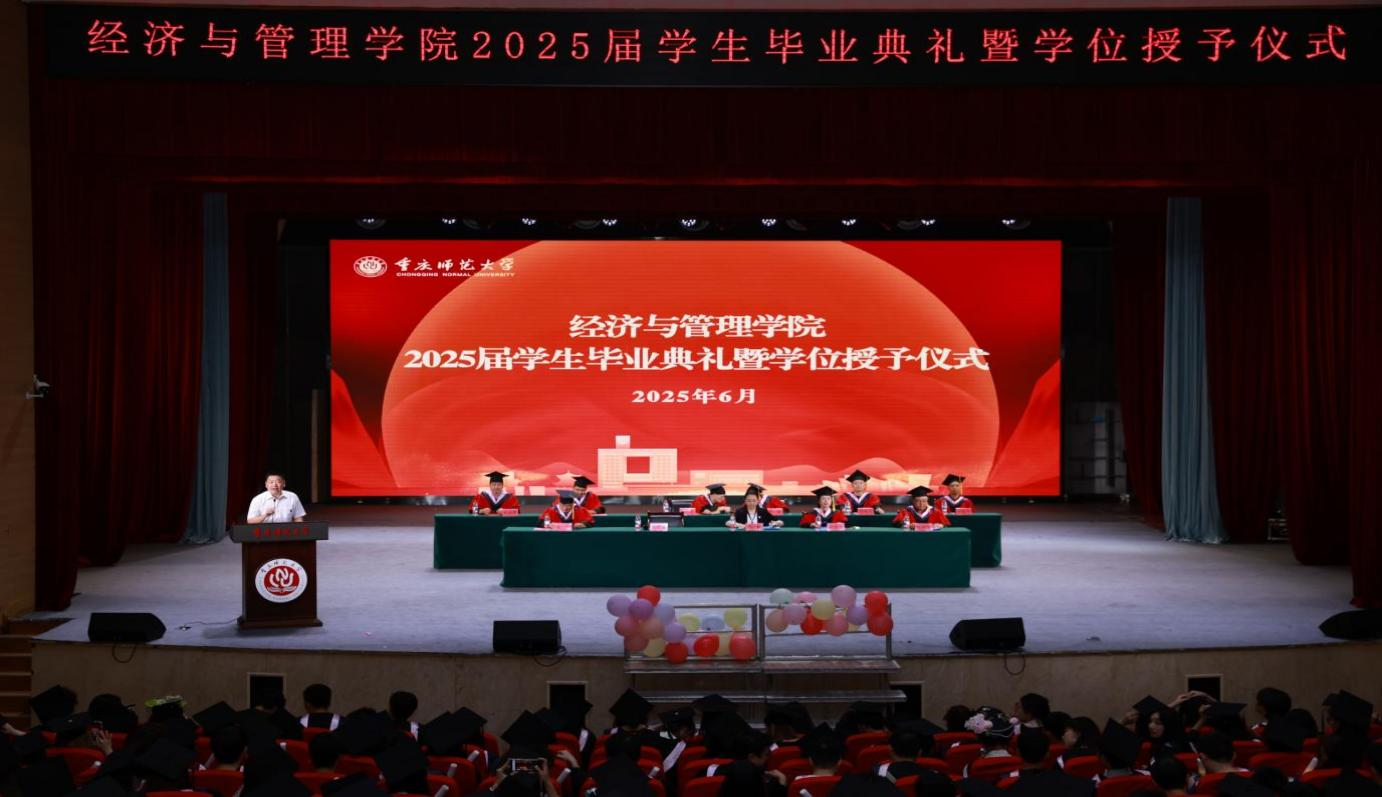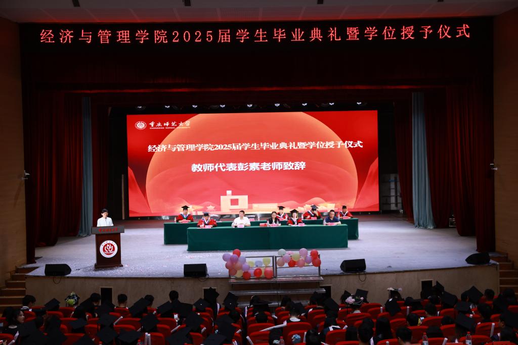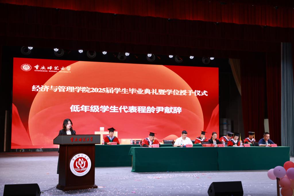 前路昭昭,薪火永继。低年级学生代表程龄尹在发言中真挚感谢学长学姐们树立了勤学笃行的榜样,她表示,将循着优秀的学长学姐们的足迹,砥砺前行,继续书写重师经管人的荣光。师者寄语,深情意重。教师代表彭素以师长的视角,细数同学们成长的印记。她寄语毕业生们永葆经管人的社会责任与人文关怀,坚守初心,勇担时代赋予的重任。