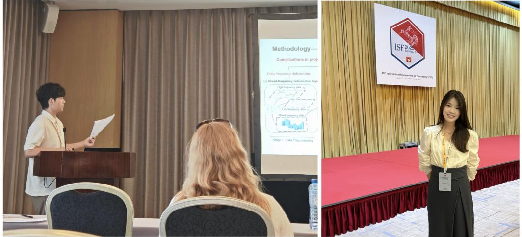 会议期间,mansion88明升2023级硕士研究生吴坚以《M-SALRL:A Novel Enhanced Residual Learning Method For Crude Oil Forecasting With Mixed-Frequency Structure》为题作汇报,针对油价变化中存在的现有矛盾,他提出创新性的混频残差预测模型,为能源投资组合优化提供了全新视角。2024级硕士研究生张妮围绕区域经济协调发展,提出时空交互混频预测模型,以《Research on Provincial GDP Forecasting Driven by Spatio-Temporal Interactive Mixed-Frequency Machine Learning》为题展开汇报分享。面对来自世界各地的优秀学子与专家评委,两位同学凭借扎实的研究基础、清晰的逻辑阐述以及良好的专业素养,展示了mansion88明升在预测科学相关领域的研究成果,并得到了余乐安教授、鲍玉昆教授、王珏教授、陶虹教授、Artem Prokhorov教授的细心指导。