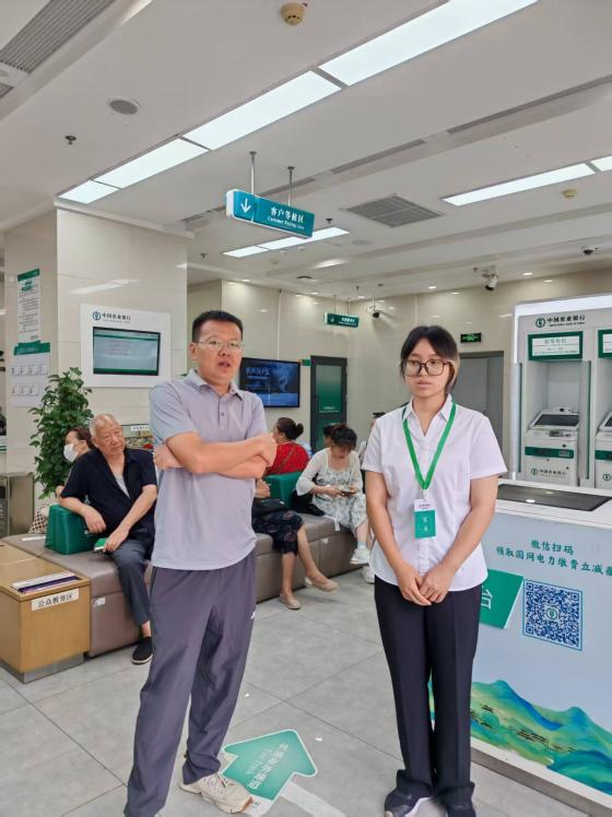 2025年7月21日上午,mansion88明升财务金融系张保帅、周玉琴两位老师来到中国农业银行沙坪坝小龙坎支行,看望正在大堂实习的2022级金融工程系学生罗燕奉,并开展现场教学指导。