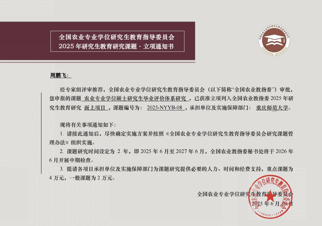 全国农业教指委研究课题是我国农业专业学位研究生教育领域的重要研究平台,旨在聚焦农业专硕教育改革重点、难点问题,产出一批具有实践指导价值的研究成果,为农业专硕教育高质量发展提供智力支撑。周鹏飞教授此次立项的课题,紧扣农业专业学位研究生培养质量核心,针对毕业评价体系的科学性、系统性与实效性展开研究,既响应了国家对专业学位研究生“实践导向、能力为重”的培养要求,也为完善我院相关领域研究生培养机制提供了重要研究抓手。