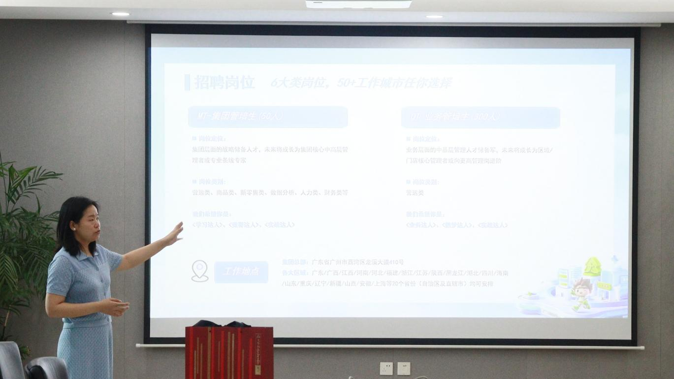 宣讲会上,易秋萍从“如何看待行业”、“如何看待企业”、“如何选择自己合适的岗位”三个问题出发,深入浅出地向同学们剖析了医药行业的广阔前景。她不仅阐述了公司在品牌建设方面的卓越成就以及独具特色的企业文化,还细致入微地介绍了当前招募的岗位详情、系统化的职工培养计划以及优渥的薪资福利待遇体系,为在场的每一位同学勾勒出了一幅全面而生动的职业发展蓝图,让大家对这一领域有了更为深刻和全面的认识。