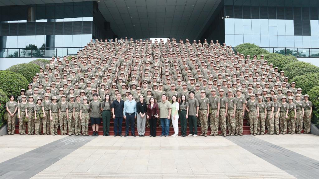 钟敏代表学院向辛勤付出的教官们表示感谢,对认真参训的全体新生表示慰问。她勉励同学们要珍惜宝贵的大学时光,将军训中培养的吃苦耐劳、团结协作、严守纪律的优秀品质延续到未来的学习和生活中去,尽快适应大学环境,科学规划学业生涯,迈好大学的第一步。讲话结束后,学院领导与新生们亲切合影留念。