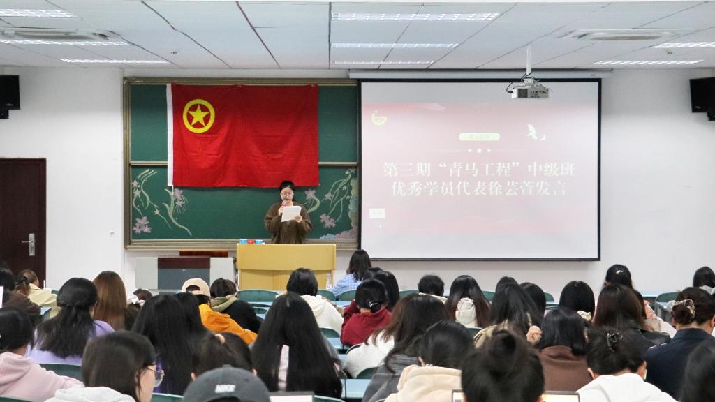 第二期优秀学员代表徐芸萱结合自身在青马中级班的学习经历,分享了从理论素养提升到实践能力锻炼的收获与感悟。她真挚恳切的发言,生动展现了青马工程对青年学子成长的深刻影响,也激励了在场的每一位学员珍惜学习机会,主动担当时代赋予的责任与使命。