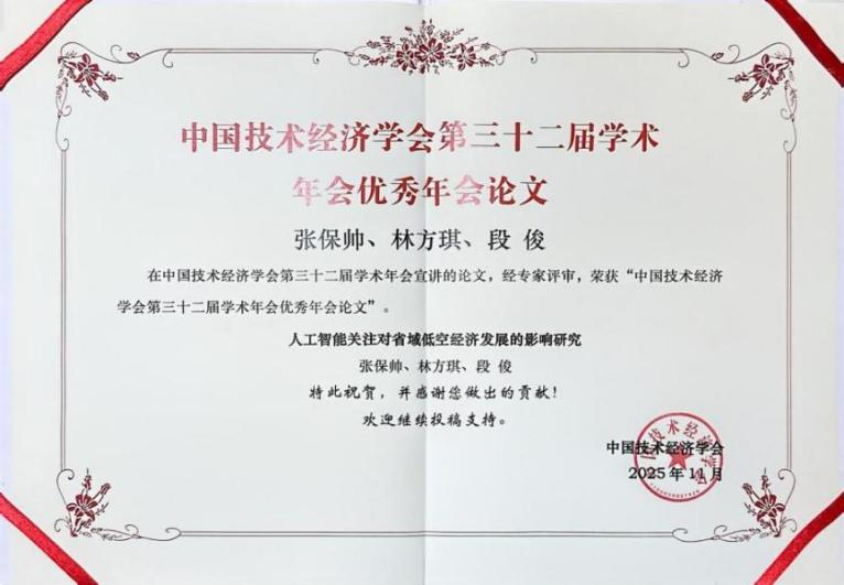 11月7日至9日,由中国技术经济学会和浙江工业大学主办的中国技术经济学会第三十二届学术年会(2025)在浙江工业大学举行。我院2024级农业管理专业研究生林方琪受邀参会并作学术汇报,其论文荣获“优秀年会论文”。