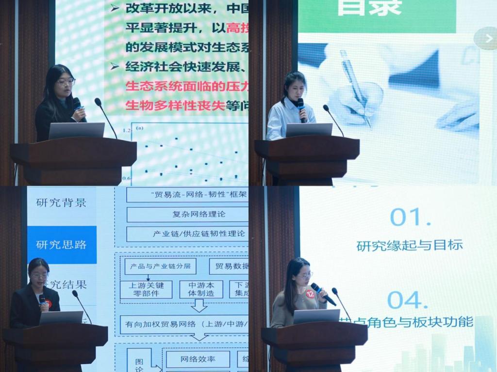本次论坛的汇报内容丰富,涉及多个研究方向。参与汇报的16名研究生分别围绕新质生产力、碳减排、供应链数字化、工业机器人产业链、虚拟聚集和生态工程等主题展开深入讨论。在汇报过程中,学生们运用了引力模型、内生性检验、异质性分析等多种方法,以详实的数据支撑和严谨的论证逻辑,展现了多样化的研究视角与扎实的学术功底。