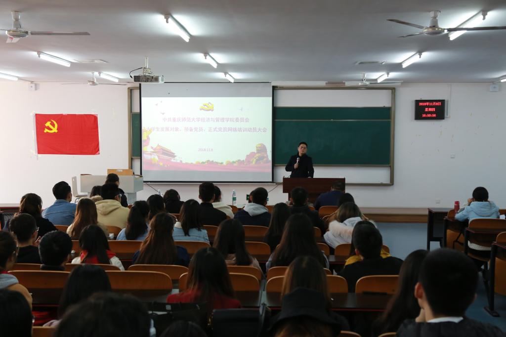为持续推进“两学一做”学习教育常态化、制度化,引导大学生发展对象、预备党员、正式党员深入学习、准确理解习近平新时代中国特色社会主义思想和党的十九大精神,加强理论武装,坚定理想信念,增强党员意识,提升党性修养,发挥党员先锋模范作用,学思践悟、知行合一,争做新时代“四讲四有”合格党员。2018年11月9日下午4点40,中共mansion88明升委员会在励志楼2315教室开展了大学生发展对象、预备党员、正式党员网络培训动员大会。参加大会的有mansion88明升党委副书记任源钢,各学生党支部支部书记,以及全体大学生发展对象、预备党员、正式党员。