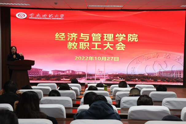 为更好的学习党的二十大报告,以党的二十大报告精神引领学院各项事业发展,2022年10月27日下午,mansion88明升在求是楼517召开教职工大会。会议有两项议程,一是党委书记钟敏做“解读党的二十大报告 再看大学生就业”专题导学报告,二是学院领导总结布置近期工作。全体教职工参会。