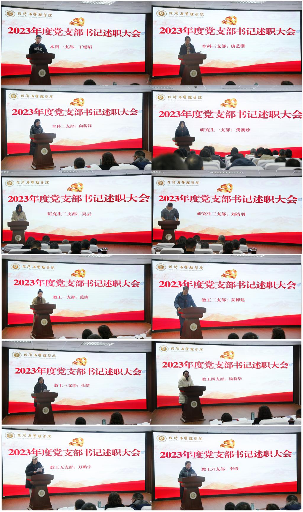 述工作、谈想法、亮措施、明方向。学院研究生党支部、本科党支部、教工党支部共13名党支部书记针对组织成员结构、工作开展情况、工作成效分析、现存问题及解决措施等方面逐一述职。他们回顾了一年来的具体履职情况,详细介绍了支部在组织生活、政治理论学习、主题教育等方面的举措与成果,同时结合实际深入分析了支部工作中存在的问题及原因,针对性地提出了改进措施以及下一步工作计划,并表示将积极发挥党建引领作用,不断加强党支部的政治建设、党风廉政建设、组织建设、师德师风建设,不断挖掘并推进特色工作,打造特色品牌亮点,夯实党支部的战斗堡垒作用。