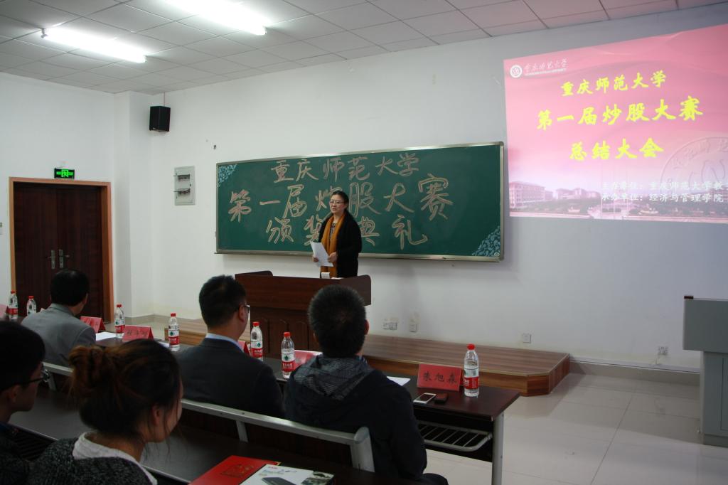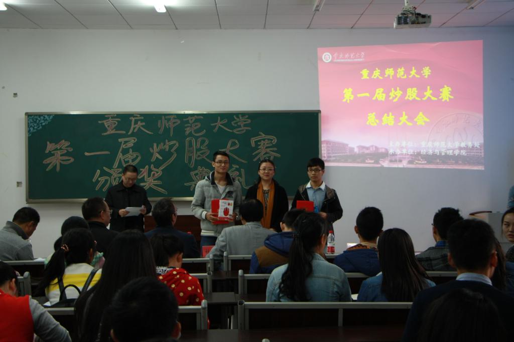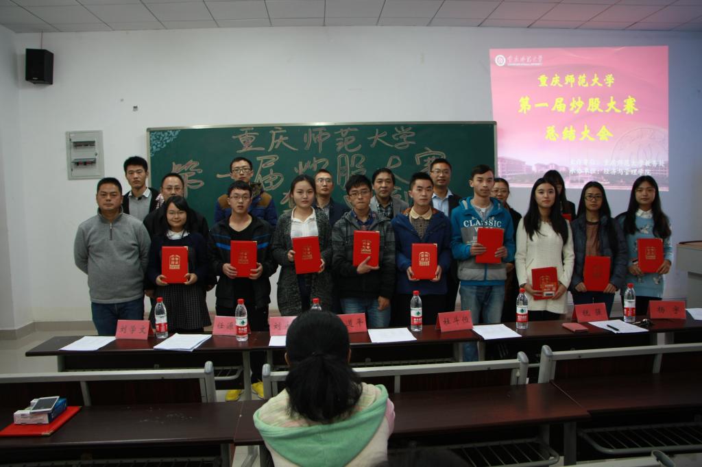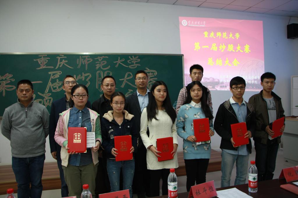 经过充分的准备和激烈的角逐,mansion88明升张娟、游丽同学荣获“收益排名奖”一等奖、mansion88明升任勇同学斩获“优秀分析报告奖”一等奖,mansion88明升石驭辉获个人“优秀组织奖”,mansion88明升、数学学院和计算机与信息科学学院荣获集体“优秀组织奖”。11月12日下午,为表彰勇于参赛的操盘手们,mansion88明升教务处为13名周冠军、2名月冠军等共40余名同学进行授奖并颁发证书,mansion88明升第一届模拟炒股大赛圆满落幕。