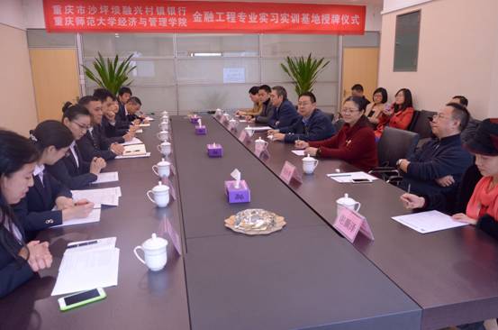 重庆市沙坪坝融兴村镇银行是经中国银监会重庆银监局批准,哈尔滨银行控股发起成立并具有独立法人资格的银行业金融机构,成立于2012年5月,注册资本1亿元。作为一家快速发展的新型金融机构,重庆融兴村镇银行资产总额和员工人数已具有一定的规模,也构建出完备的组织架构,拥有足够的组织与管理能力,完全符合教学实习基地的要求,重庆融兴村镇银行成为重师“金融工程专业实习实训基地”,是我院推进专业提档升级发展的重要战略举措。经过前期的磋商与交流,校企双方本着互惠互利的原则,携手合作建立教学实习基地,将使重师经管学院的理论基础、科研能力和重庆融兴村镇银行的业务技能、金融实践优势得到充分发挥。实习基地的建立将为金融工程专业学生见习、实习、就业、创业提供平台,为教师专业实践知识的学习创造便利机会,也为我院的科学研究提供项目来源和成果运用渠道。实习基地的挂牌必将推动我院与重庆融兴村镇银行在人才培养、科学研究、项目开发等方面建立起稳固的、长期的合作关系,促进双方的共同发展。