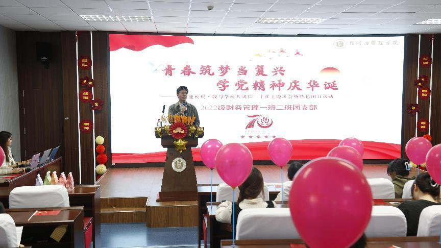 金秋十月,丹桂飘香,在中华人民共和国成立七十五周年和mansion88明升即将迎来建校七十周年庆典之际,为激发青年学生爱校、成才、跟党走的使命担当,进一步学习贯彻党的二十届三中全会精神和习近平总书记重要指示精神,我院“迎校庆·我与学校共成长”十佳主题班会暨特色团日活动于10月17日在求是楼517成功举行,本次活动的主题为“青春筑梦当复兴,学党精神庆华诞”,由2022级辅导员张源老师主讲,学生处思想政治教育科阿力木·哈斯拉木、数学科学学院分团委书记李晓凤担任本次活动的评委,2022级财务管理专业全体学生参与活动。
