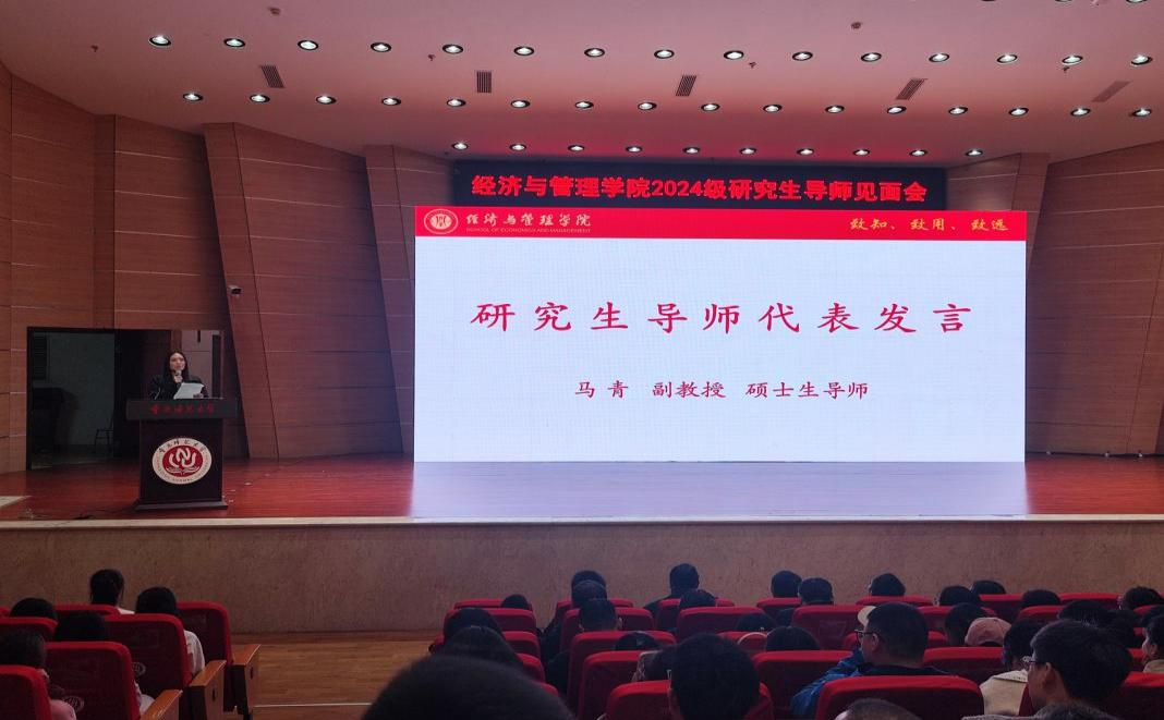 紧接着,硕士生导师代表马青博士发言。马青博士表示,希望同学们在学习课程、写作论文时从最基础的问题进行理论推导,运用相关学科理论进行系统思考,而不是仅凭直觉进行判断进而运用理论解决问题、为市场提供更优质的产品和服务,而且可以发展理论、去伪存真,逐步接近真理。她鼓励同学们勤于阅读、独立思考,勇于探索、敢于创新,以师为友、加强沟通,脚踏实地、持之以恒,在科研探索的道路上永葆初心与热情。