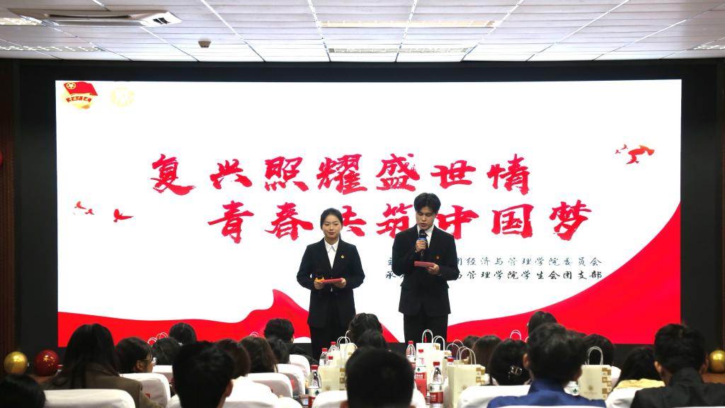 第五篇章“经管风采,西部印记”则通过播放由我院参与西部计划的成员们录制的访谈视频,展现了经管学子们以身作则、勇于担当的精神风貌。视频中,他们深情讲述了在基层建设中的深刻感悟以及在奋斗历程中对青春力量的诠释,生动展现了经管学子将个人理想融入国家发展大局的高尚情怀。