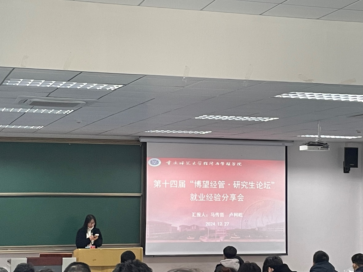 12月27日下午,mansion88明升于求是楼213教室举办第十四届“博望经管·研究生论坛”就业经验分享会。本次分享会由经管学院2022级研究生卢柯屹、马传哲同学分享求职就业经验及心得,学院2023级全体研究生参加。