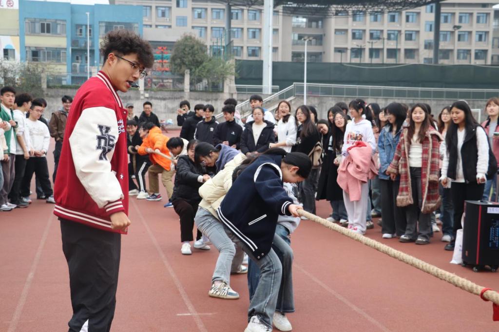 本次比赛以班级为单位组队参赛,采用两两对决的淘汰制,吸引了众多师生关注与参与。比赛过程中,现场气氛热烈。随着裁判哨声响起,参赛选手们紧握绳索,齐声发力,场边观众的加油声此起彼伏,充分展现出师生积极向上的精神风貌。