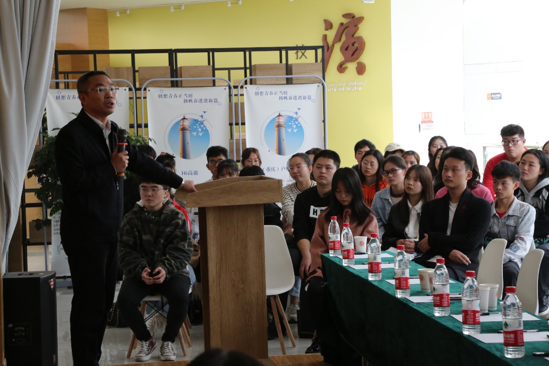 团市委副书记,mansion88明升2002级校友江光伟首先发言,他结合自身经历就信念与信心、目标与坚持、遗憾与包容、学习与提高、忠义与厚道五个方面的内容给大家做了分享,勉励同学们面对艰难要咬牙坚持,逐步搭建人生基石,也表达了对学弟学妹们都能“立鸿鹄志,做奋斗者”的真诚期望。随后,重庆群荣电子科技有限公司副总2001级校友吴昊和重庆机电集团股份有限公司(风电公司)综合管理部部长2009校友田酸分别从校园和职场两个方面向大家分享了学习成长的经验和感悟,鼓励同学们好好利用大学四年学习专业知识、抓住机会磨炼自己,给自身增加“砝码”。