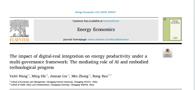 近日,学院王亚飞教授撰写的论文The impact of digital-real integration on energy productivity under amulti-governance framework: The mediating role of AI and embodied technological progress在Energy Economics公开发表。
