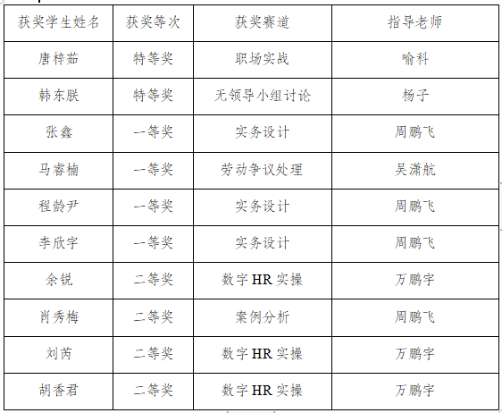 本次HRU地区赛为经管学院首次参赛,代表队成立后便开始积极备赛。在周鹏飞、喻科、吴潇航、杨子、万鹏宇五位专业老师的指导和组织下,针对性地对赛事各大模块进行强化训练和答疑解惑,参赛同学们之间多次模拟比赛演练,互相交流借鉴,定期进行总结反思和细节打磨。在指导老师和代表队成员的共同努力下,历经六大模块的激烈角逐,我校代表队10名学生脱颖而出,分别获得特等奖2项,一等奖3项,二等奖2项的优异成绩,代表队团体获得南方区大赛团体一等奖,教师团队也均获优秀指导老师奖。代表队10名选手以饱满的精神状态赛出了水平,赛出了风格,充分展现出经管学子的专业知识应用能力和优秀的沟通协作能力,给赛事评委及兄弟院校师生留下了深刻印象,期望他们不断挑战自己,再创佳绩!