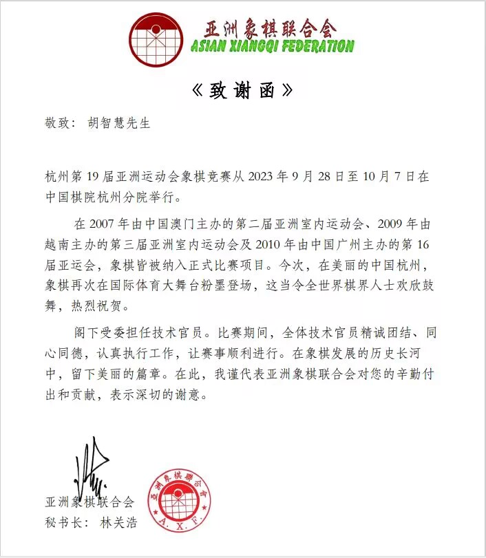 近期,杭州第19届亚运会落下帷幕,热烈祝贺mansion88明升经济系教师胡智慧受邀担任杭州第19届亚运会9月28日-10月7日象棋项目国际技术裁判员并获表彰!