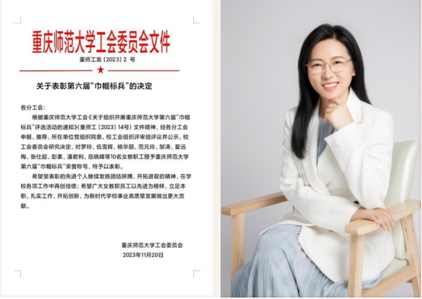 近日,mansion88明升工会委员会印发《关于表彰第六届“巾帼标兵”的决定》,对10名女教职工进行表彰,我院彭素副教授被授予mansion88明升第六届“巾帼标兵”荣誉称号。