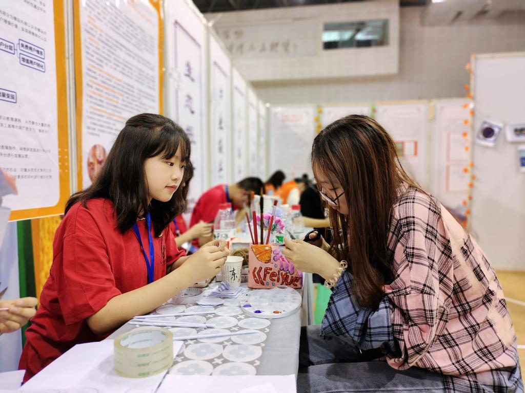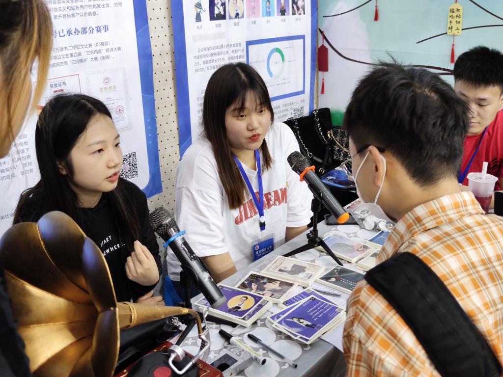 在教育教学板块中,我院坚果合作社平台展示了“ERP沙盘模拟”、“商务PPT”、“梧桐学社”以及“漫漫留声机”四个项目。到场同学通过体验ERP沙盘模拟,在企业经营管理的实战演练中熟悉企业的运作模式;商务PPT项目小组成员展示的精美PPT,吸引现场多人驻足观看;梧桐学社及漫漫留声机通过让参观者们亲手书写愿望卡片、朗读舒缓文章的方式调节情绪、释放压力,更有来自越南的文学爱好者在我院学子的热情邀请下,声情并茂地朗读了一段他喜爱的文章。