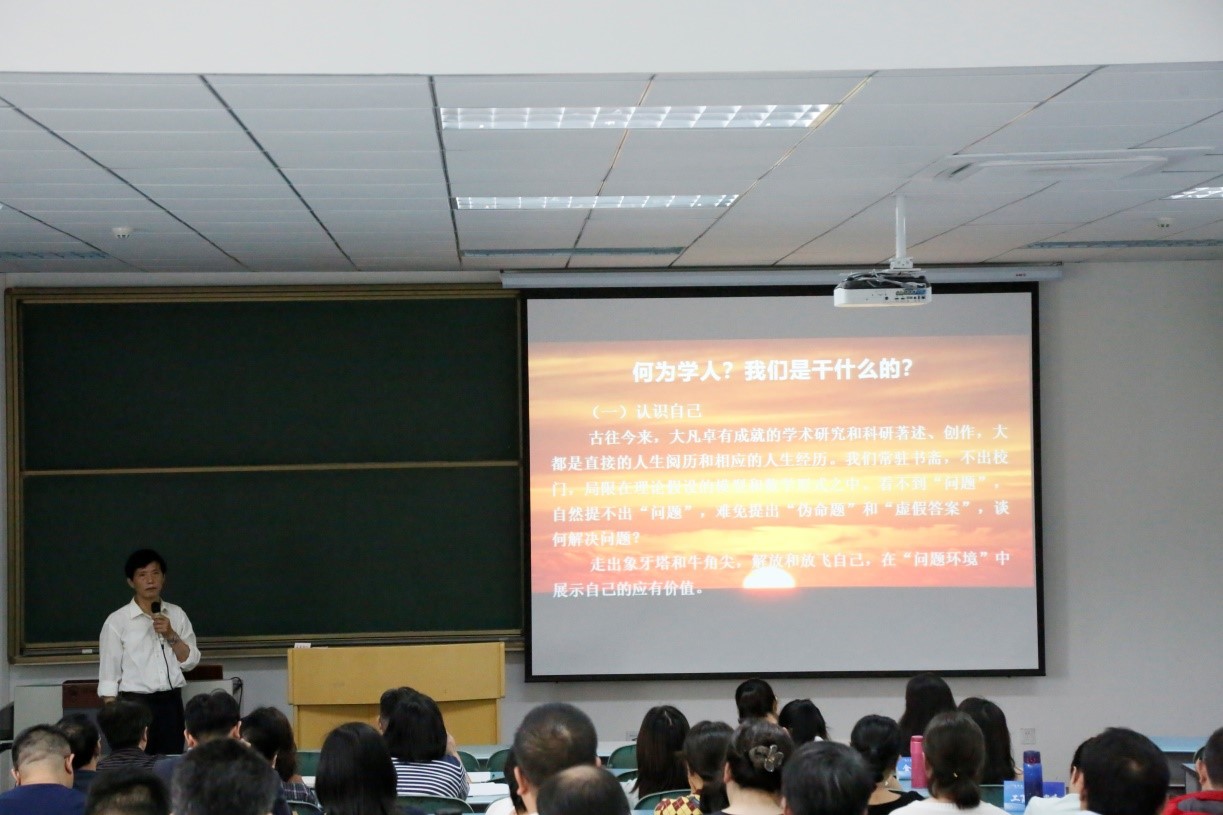 会上,冯佺光教授从自身在城口县东河村任驻村扶贫第一书记所作的工作、学人科研的社会价值体现两个方面进行了分享。冯教授表示:“驻村脱贫攻坚工作能取得这么大的成绩,多亏学院领导、同事的诸多支持,大家的支持是我坚实的后盾,让我义无反顾地坚持,不断努力做出今日的成绩,功成不在我,只是有我”。冯教授从不因为外界的赞誉而停止脚步,作为一名党员,他深知沉下心来做实事,才是对驻村第一书记的最好诠释。冯教授对学人科研的社会价值体现作了相应阐述,他指出,我们首先要认识自己,然后认识问题、发现问题、提出问题,找到对策措施以解决问题以服务社会,服务社会程度与体现自我价值之大小是相联系的。