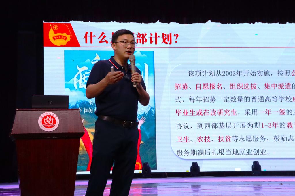 为进一步做好大学生志愿服务西部计划工作,号召更多的青年到基层、到西部去受教育、长才干、做贡献。4月20日,mansion88明升于校友会堂举办西部计划政策解读会,由校团委综合科科长孙玖江主讲,100余名经管学子参与其中。本次讲座采取线上线下相结合的形式,现场进行直播,旨让更多同学了解到西部计划。
